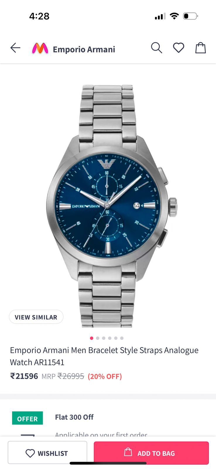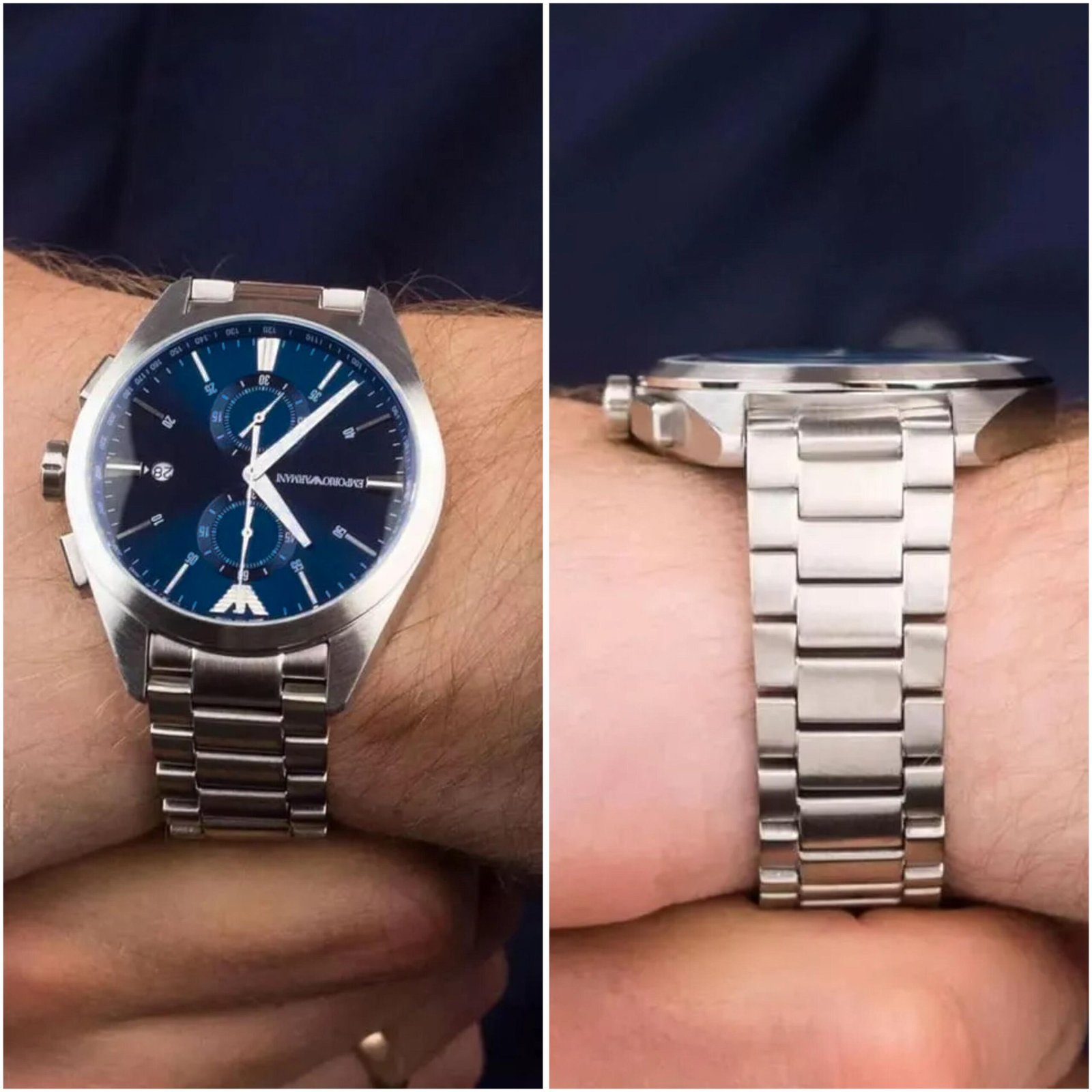 ✅*Emporio Armani’s 43mm watch features a Blue sunray dial with cd finishing on counters, chronograph movement and silver stainless steel bracelet.* ✅