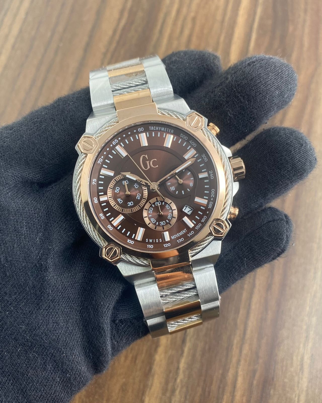 *✅Gc Guess✅* 👉Men 👉Tu tone belt 👉Y24002GMF 👉7aa quality 👉Case size 44Mm 👉All Working Charonograph 👉Quartz Japan moment 👉Stop watch