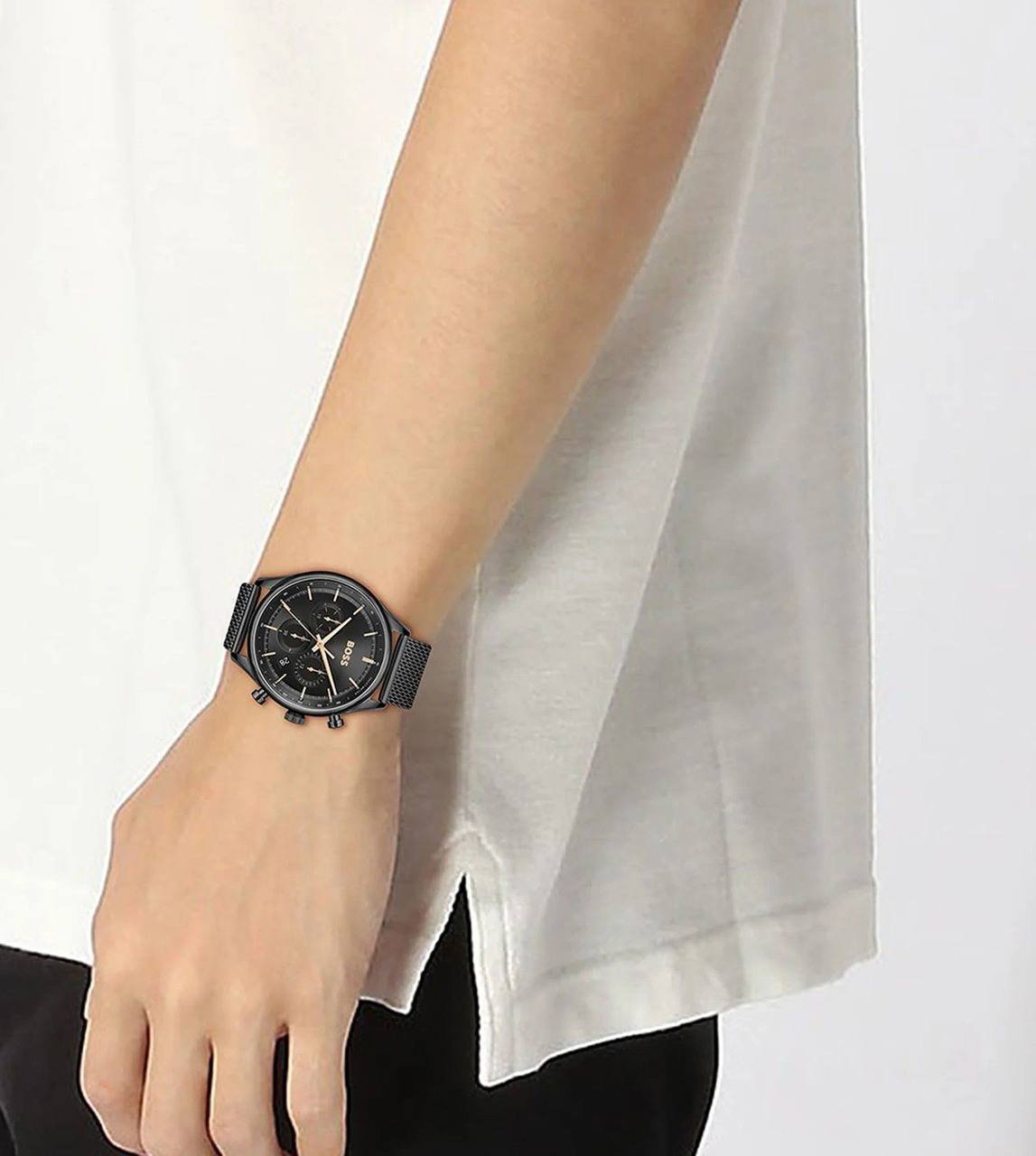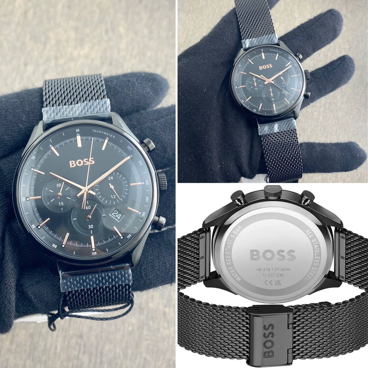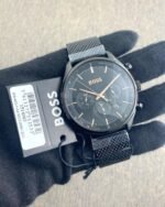 * Push yourself beyond your own limits to perfect your performance. The BOSS Velocity is for those who strive day after day to beat the best of the best. This stylish sports chronograph features a 42mm black Stainless steel Plated case, Black redy bezel, black dial, black Sefar belt with BOSS branding and BOSS buckle.