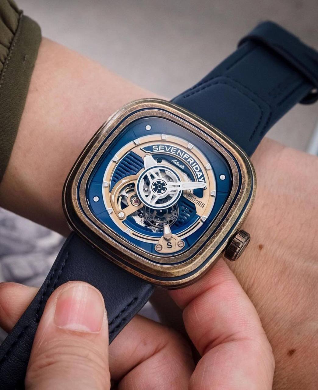 👉🏽 Features: Powered by original Japanese self-winding automatic machinery, Stainless-steel Gunmetal Matte Carbon Finish square case, Sapphire glass on a skeleton dial, *with in-built *NFC Authorization* chip in the back, fastened by a high grade Blue leather strap with contrast stitching and pin buckle.