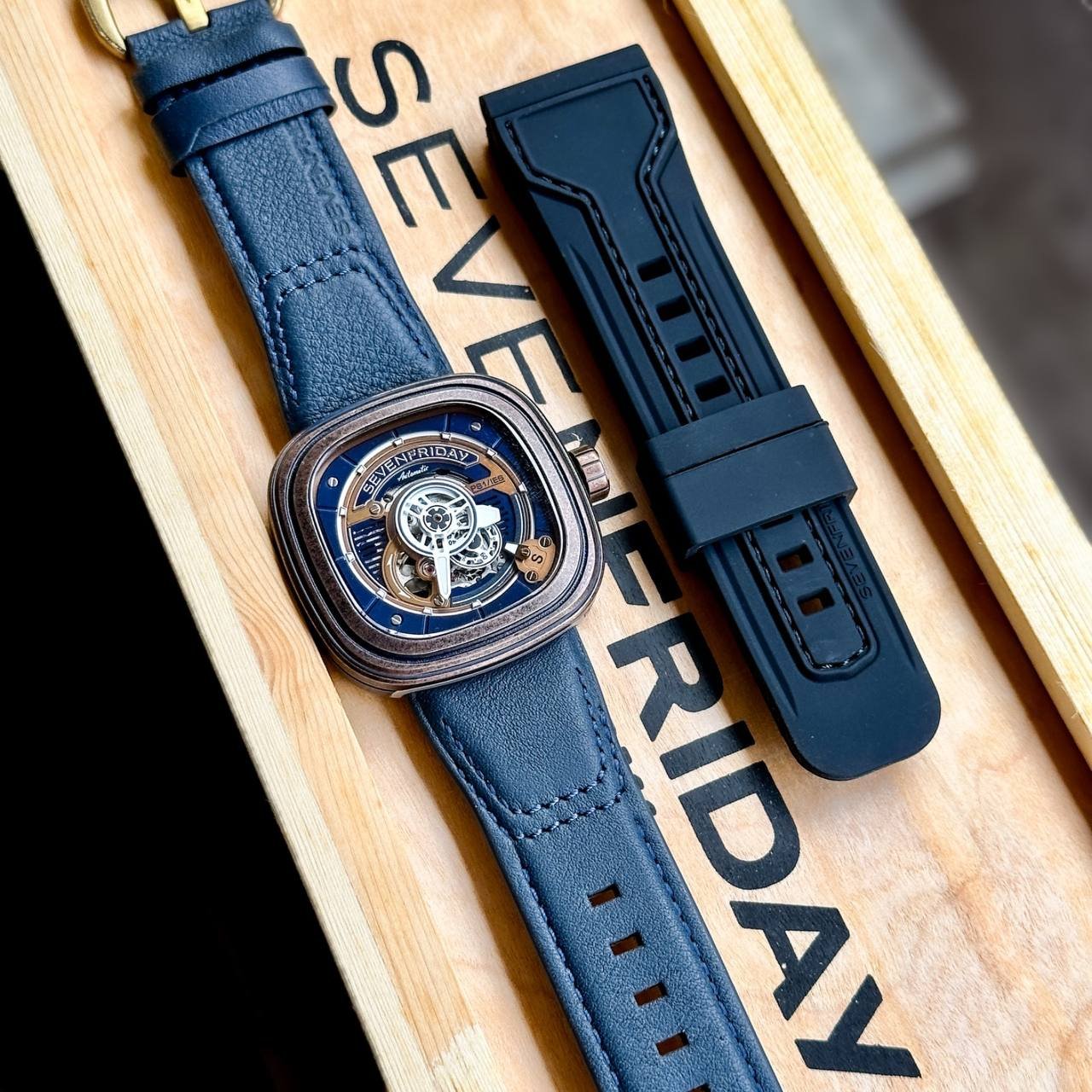 _..The Sevenfriday PS1/04 Encased in a 47.6 mm (W) x 47 mm (H) stainless steel Gun Metal case with a Croco animation ring. Electric insert Silver surrounds the dial which has a base of horizontally striped gun metal contrasted with a SEVENFRIDAY logo picked out in Black colour…_