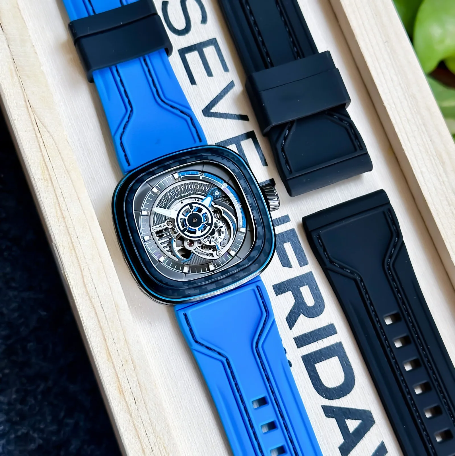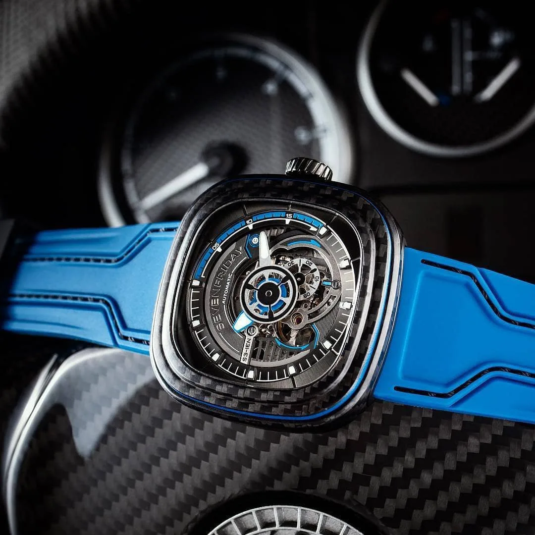 ❣️_..The Sevenfriday S3/02 RUNWAY in a 47.6 mm (W) x 47 mm (H) stainless steel case with a full animation ring. Electric Black insert surrounds the dial which has a base of horizontally striped gun metal contrasted with a SEVENFRIDAY logo…_