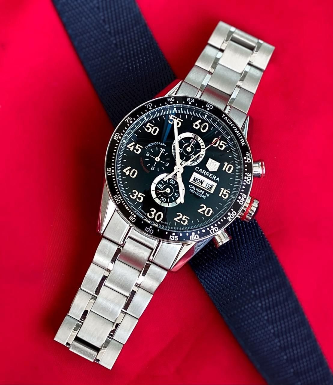 ⭐️ *The sleek, heritage-style design of the TAG Heuer Carrera Calibre 16 Day-Date hearkens back to the collection’s earliest racing roots. The uncluttered, all-black dial is legible in even the most challenging conditions.* ⭐️